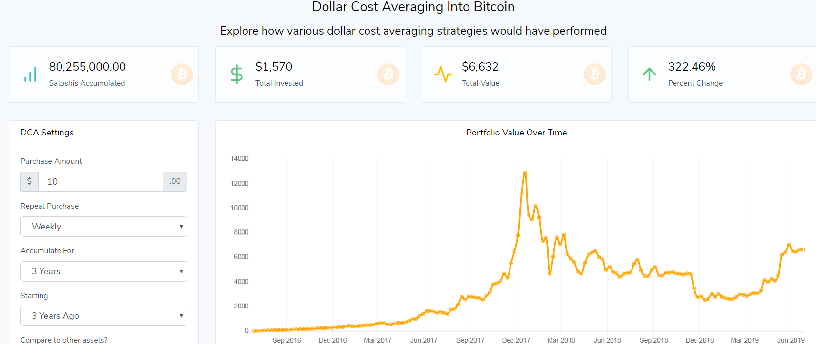 Al seguente sito dcabtc.com è possibile simulare il rendimento che avremmo potuto avere investendo in BTC negli anni passati.